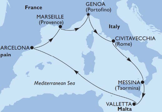 Dobrodošli na MSC World Europu jedan od najnovijih brodova flote MSC Cruisesa. Naša avantura započinje u slikovitoj Genovi, gdje ćete se ukrcati na brod i započeti svoje putovanje. Prva postaja je Civitavecchia, vrata do vječnog grada Rima, gdje ćete imati priliku diviti se njegovim svjetski poznatim znamenitostima. Sljedeća postaja je Messina, grad bogate povijesti i kulture, smješten na prekrasnoj Siciliji. Dalje, putovanje nas vodi do Vallette, glavnog grada Malte, koji oduzima dah svojim srednjovjekovnim zidinama i povijesnim zgradama. Nakon dana plovidbe i opuštanja na brodu, stižemo u Barcelonu, živahni katalonski glavni grad poznat po svojoj arhitekturi i kulturi. Na kraju, posjetit ćemo Marseille, najstariji grad Francuske, poznat po svojoj bogatoj povijesti i mediteranskoj atmosferi. Ovo krstarenje pruža savršenu ravnotežu opuštanja i avanture, uz vrhunsku uslugu i udobnost na brodu. Pridružite nam se na ovom nevjerojatnom putovanju i stvorite uspomene koje ćete zauvijek nositi sa sobom.