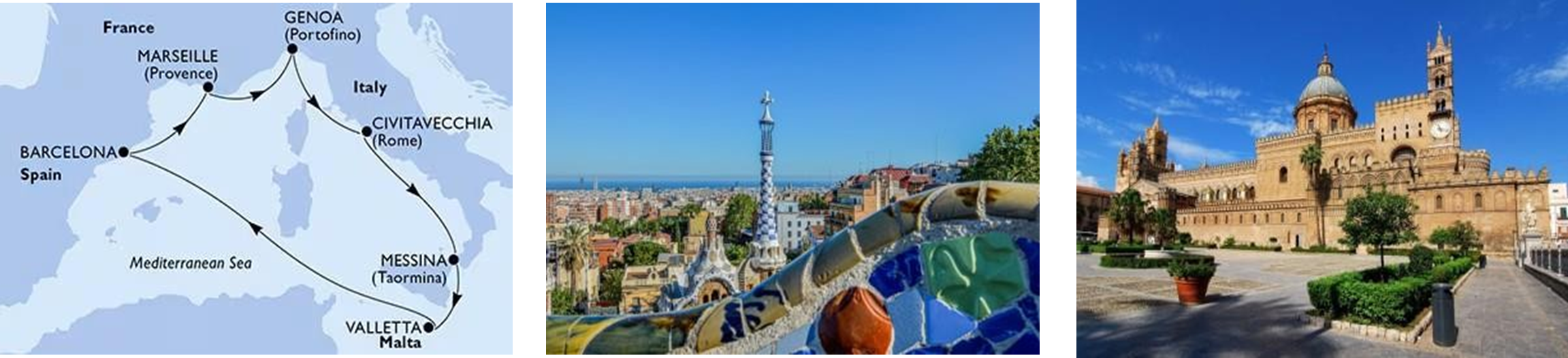 Dobrodošli na MSC World Europu jedan od najnovijih brodova flote MSC Cruisesa. Prva luka na našem krstarenju je Civitavecchia, mali šarmantni gradić na talijanskoj obali koji je smješten samo sat vremena od Rima – centra bogate antičke kulture. Udahnite povijest Rima i zaljubite se u njegovu veličanstvenu ljepotu. Nakon istraživanja grada posjetite jedan od brojnih restorana i isprobajte najbolju carbonaru na svijetu. Drugi dan našeg krstarenja vodi nas do Messine. Messina je grad u Italiji, treći po veličini grad na Siciliji i glavni grad istoimene pokrajine na jugu Italije. Leži u blizini istoimenog Mesinskog tjesnaca, koji Siciliju odvaja od ostatka talijanskog kopna. Nakon Sicilije dolazimo u Vallettu. Valletta je barokno remek-djelo i čitav grad je proglašen UNESCO-vom svjetskom baštinom. Tijekom gradnje, imali su na umu da ona mora služiti i za obranu pa je utvrđena bedemima sa svih strana, a posebno lijepa je ona strana s pogledom na more. Preporučujemo boravak na palubi broda prilikom uplovljavanja i/ili isplovljavanja Nakon povijesnih gradova slijedi dan plovidbe, dan za istraživanje ovog prekrasnog broda. Dolazimo u Barcelonu, grad Antoni Gaudia. Prošećite se La Ramblom, okrijepite na La Boquerii te se zadivite ljepotom Sagrada Familie. Zadnji dan na ovom krstarenju provesti ćemo u Marseillu, drugim gradom po veličini u Francuskoj.