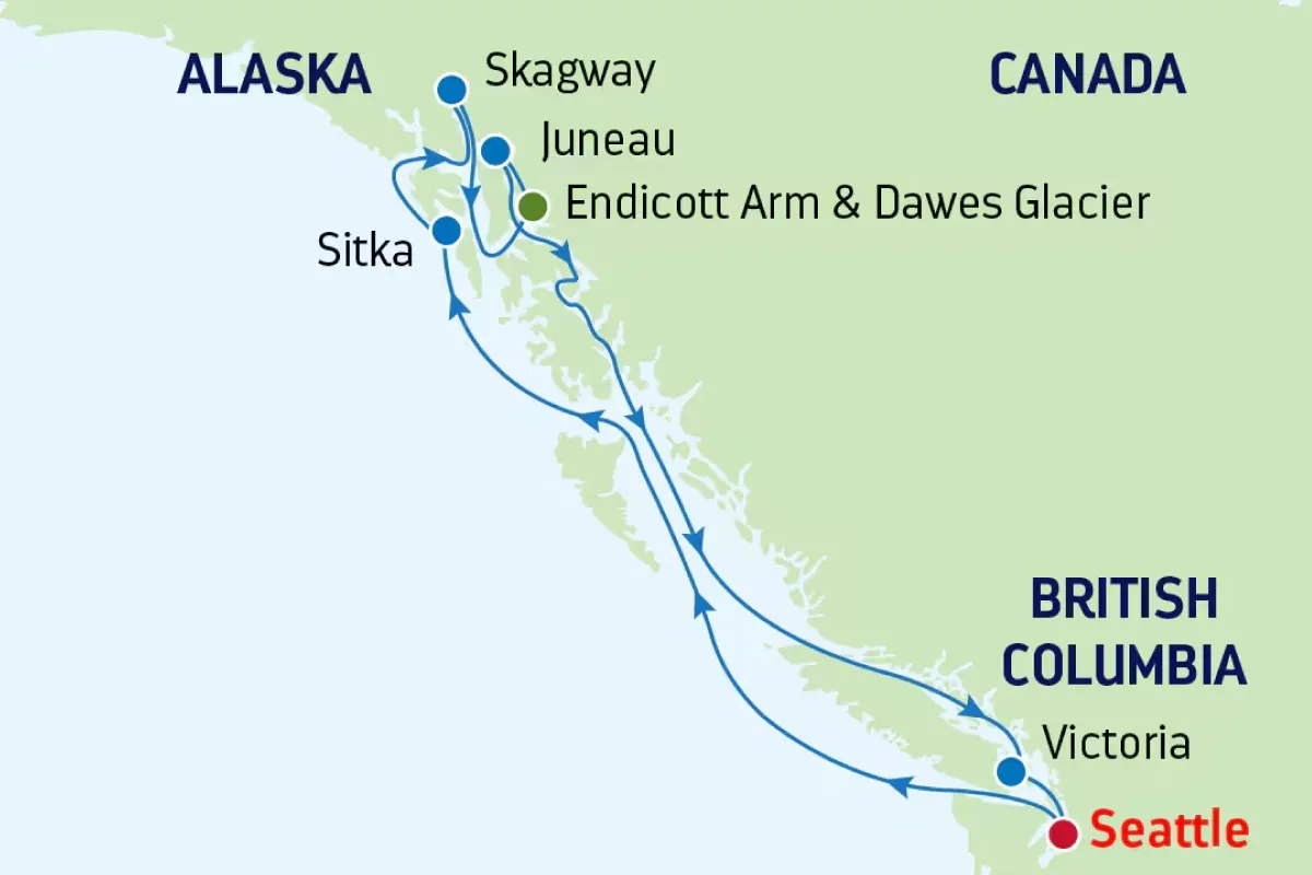 Seattle, Sitka, Skagway, Juneau, Victoria
