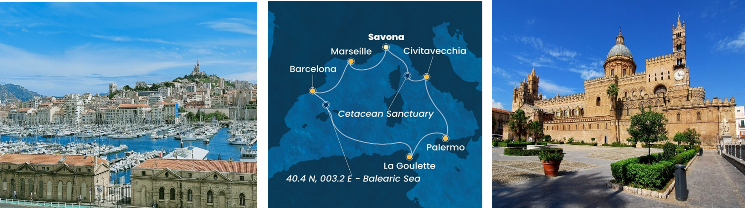 Ovo krstarenje pruža savršenu kombinaciju povijesti, kulture i prirodnih ljepota, posjećujući neke od najzanimljivijih destinacija. Krenite iz slikovite Savone, istražujući povijesni Marseille i bogatu katalonsku prijestolnicu Barcelonu. Iskoristite dan na moru za istraživanje broda i opuštanje tijekom dana na moru prije nego što stignete u Tunis. Egzotični Tunis nudi vam jedinstvenu priliku za istraživanje lokalne kulture. Prošetajte kroz uske uličice medine, istražite tržnice i okusite autentične tuniške specijalitete. Istražite plavo-bijeli Sidi Bou Said i drevnu Kartagu. Iu Palermo gdje vas čekaju slikovite uličice i prekrasni Teatro Massimo. Civitavecchia je zadnja luka na ovom krstarenju, iskoristite dan za posjet vječnom gradu – Rimu! Slijedi još jedna nezaboravna večer na brodu, uz zabavu i delicije koje vam spremaju naši domaćini. Želimo vam nezaboravno krstarenje!