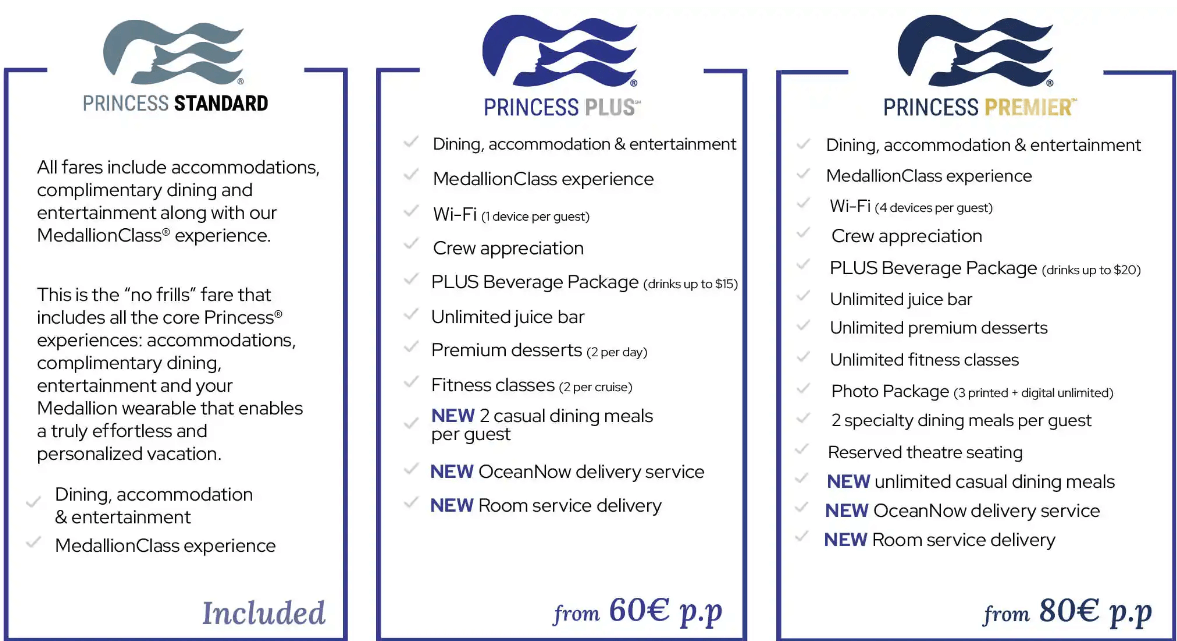 Wi-Fi (do 4 uređaja po gostu), napojnice, Premier paket pića (piće do 20 dolara po komadu), neograničen juice bar, Premium deserti (neograničeno), satovi fitnessa (neograničeno), Foto paket (neograničeno digitalno + 3 ispisa), Princess nagrade, 2 specijalna obroka po gostu, rezervirano mjesto u kazalištu (samo za produkcije), neograničen broj obroka u posebnim restoranima, posebna usluga dostave u kabinu