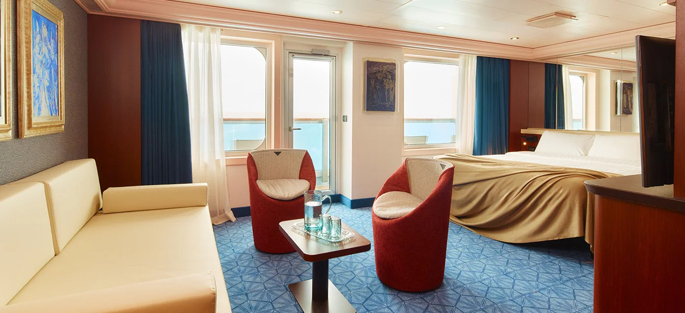 Kabine s balkonom su najveće, od 20 m² te imaju privatni vanjski prostor s manjom sjedećom garniturom za Vaš ugodniji boravak na balkonu.