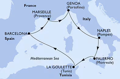 Genova (Italija), Napulj (Italija), Palermo (Italija), La Goulette (Tunis), Barcelona (Španjolska), Marseille (Francuska), Genova (Italija)